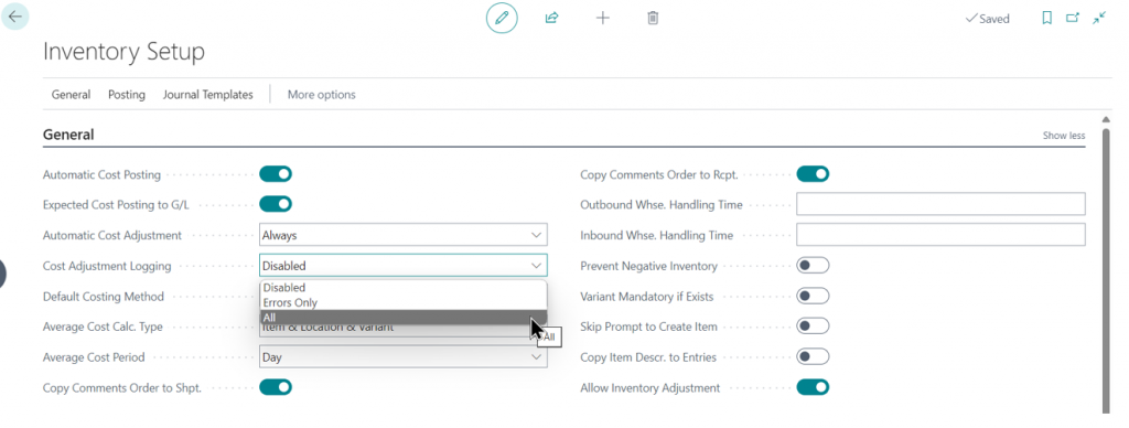 On the Inventory Setup page, the Cost Adjustment Logging field offers three options: