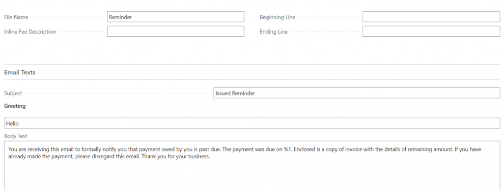 - The content for emails comes from the reminder term setup. For more details, refer to “Set Up Reminder Terms and Levels”.